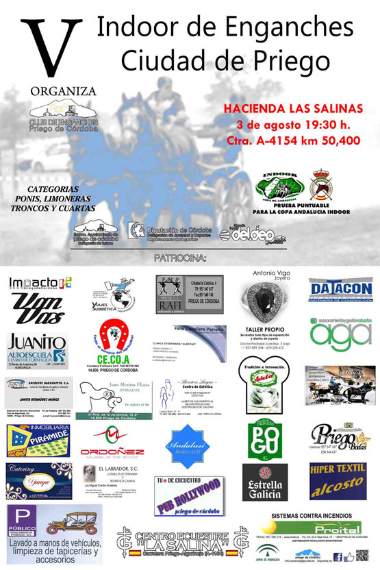El próximo día 3 de Agosto tendrá lugar en la Hacienda las Salinas, una nueva edición del Indoor de enganches Ciudad de Priego esta V edición se celebra centro del calendario de la Federación Andaluza de Hípica lo que nos asegura una mayor presencia de participante y un alto nivel de los mismos.