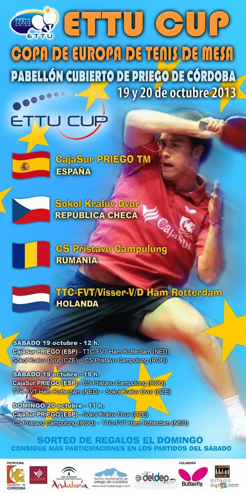 Priego de Córdoba se convierte en el epicentro europeo del Tenis de Mesa con la celebración de la segunda ronda de la ETTU CUP-Copa Europea del Tenis de Mesa, que se celebrará entre los días 19 y 20 de octubre en el Pabellón Cubierto con la participación del Cajasur Priego TM, el Sokol Kraluv Dvur de la República Checa, el CS Pristavu Campulung de Rumanía y el TCC-FVT/Visser-V/D Ham Rótterdam de Holanda.