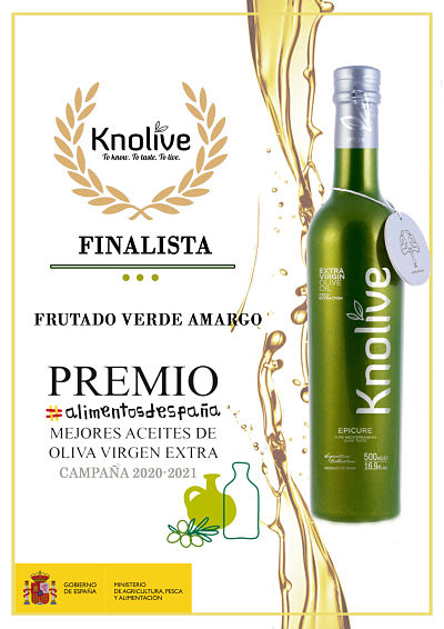 Knolive Epicure ha sido reconocido por el Ministerio de Agricultura, Pesca y Alimentación con el premio Finalista de la categoría más exigente, Frutado Verde Amargo; en los Premios Alimentos de España a los Mejores Aceites de Oliva Virgen Extra,Campaña 2020/2021. Sin duda un reconocimiento que nos llena de ilusión y nos motiva para seguirpor el mismo camino que en su día nos mostraron nuestros antepasados y nuestroalma mater -nuestro padre Francisco Yévenes- junto a nuestra madre. Va por ellos y por supuesto también va por vosotros. Muy agradecidos a todos."